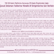 TCK 103 – Çocuk İstismarı Affına Karşı Kadın Platformu olarak ekteki metni, tüm illerden 215 kadın örgütü ile birlikte hazırladık.